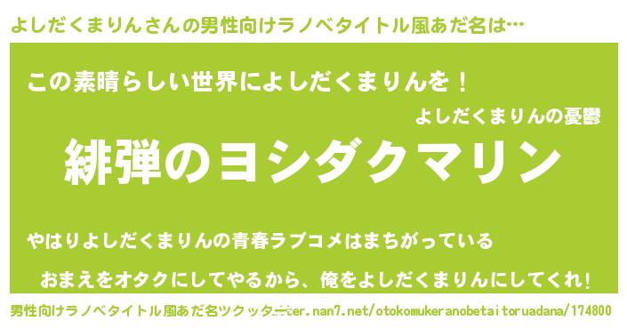 | 女子向けラノベタイトル風あだ名 | 『シンデレラよしだくまりん家の靴箱館』 |