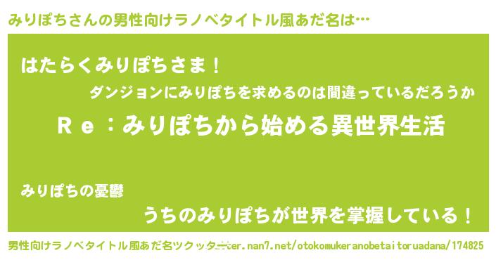 | 女子向けラノベタイトル風あだ名 | 『闇のみりぽち』『みりぽちは平凡を望む』 |