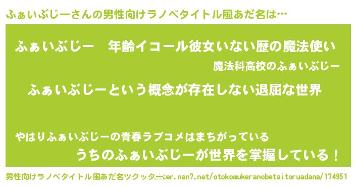 | 胡散臭い通販商品みたいなあだ名 | 『来世でも幸せになれる水素水…その名も「ふぁいぶじー」』 |