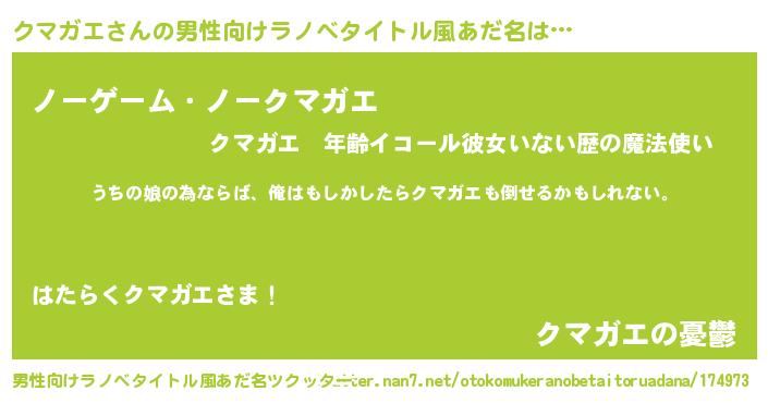| 女子向けラノベタイトル風あだ名 | 『クマガエの婚約者』『クマガエ恋絵巻』 |
