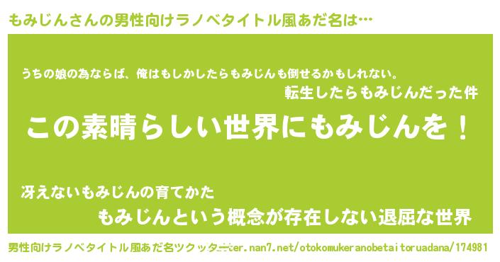 | 女子向けラノベタイトル風あだ名 | 『乙女ゲームの破滅フラグしかない悪役もみじんに転生してしまった…』 |