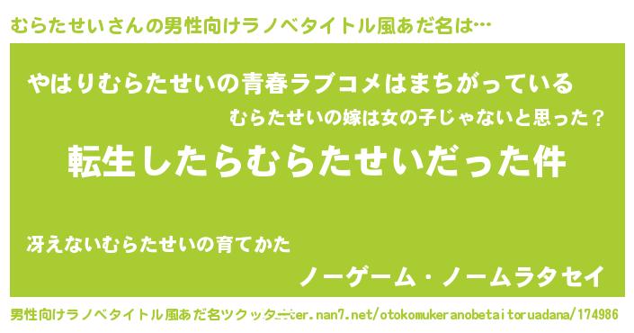 女子向けラノベタイトル風あだ名 | 『婚約破棄系悪役むらたせいに転生したので、保身に走りました。』 |