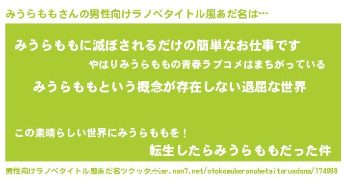 | 女子向けラノベタイトル風あだ名 | 『異世界で失敗しない100のみうらもも』 |