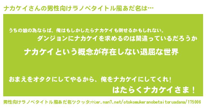 | 女子向けラノベタイトル風あだ名 | 『異世界で失敗しない100のナカケイ』 |