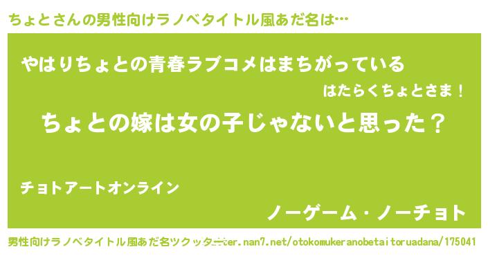 | 女子向けラノベタイトル風あだ名 | 『ちょとの卵を拾いまして』 |
