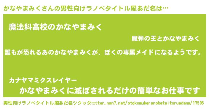 | 女子向けラノベタイトル風あだ名 | 『異世界でカフェかなやまみくを開店しました。』 |