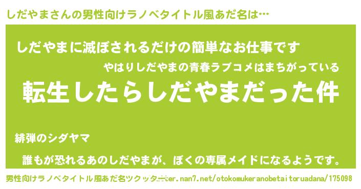 | 女子向けラノベタイトル風あだ名 | 『しだやまの玉の輿計画!』 |