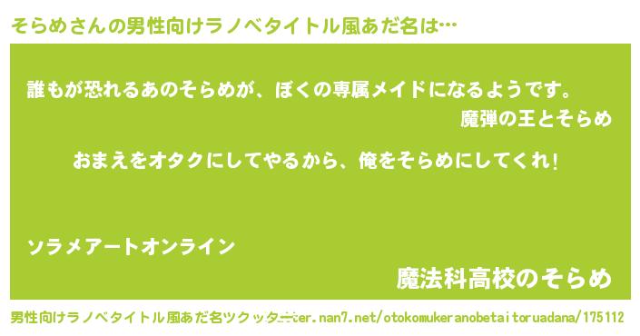 | 女子向けラノベタイトル風あだ名 | 『そらめ夫妻のなれそめ』 |