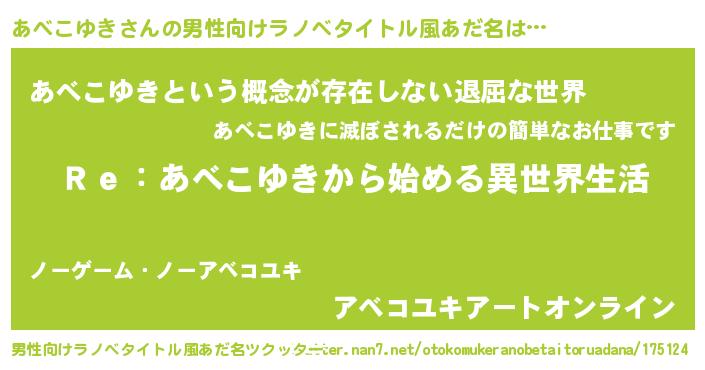 | 肩書あだ名 | 『あべこゆき総統』『あべこゆき先生』 |