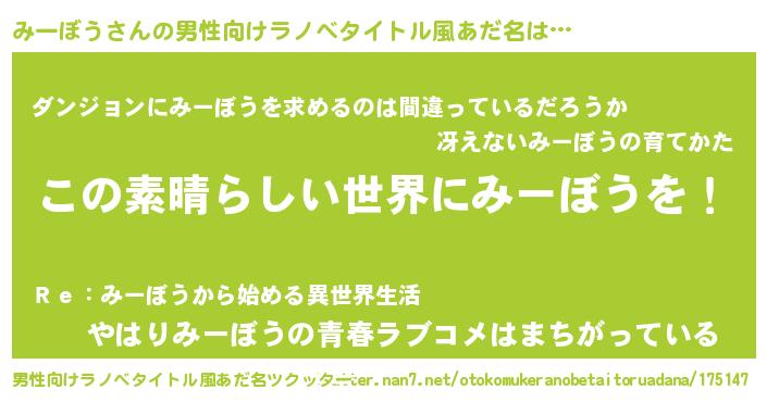 | 女子向けラノベタイトル風あだ名 | 『乙女ゲームの破滅フラグしかない悪役みーぼうに転生してしまった…』 |