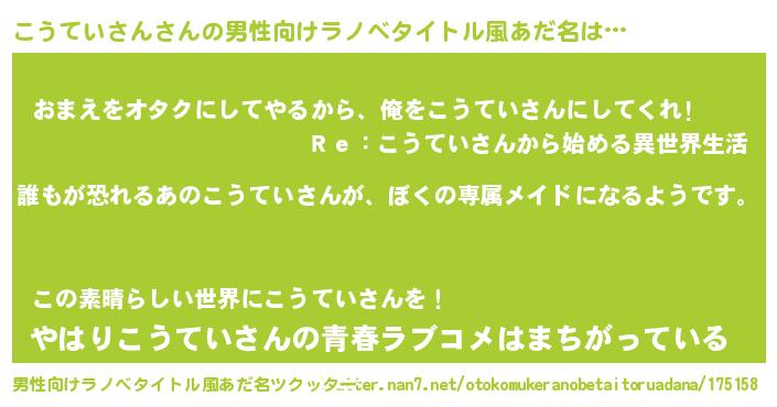 | 胡散臭い通販商品みたいなあだ名 | 『来世でも幸せになれる健康食品…その名も「こうていさん」』 |