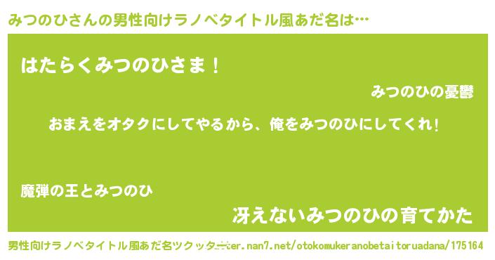 | 女子向けラノベタイトル風あだ名 | 『みつのひ夫妻のなれそめ』 |