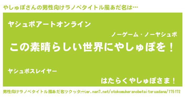 | 胡散臭い通販商品みたいなあだ名 | 『世界中を虜にした100年もののヴィンテージワイン…その名も「やしゅぽ」』 |