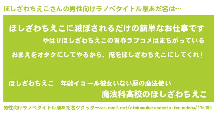 | 女子向けラノベタイトル風あだ名 | 『ほしざわちえこ夫妻のなれそめ』 |