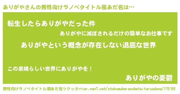| 女子向けラノベタイトル風あだ名 | 『異世界で失敗しない100のありがや』 |