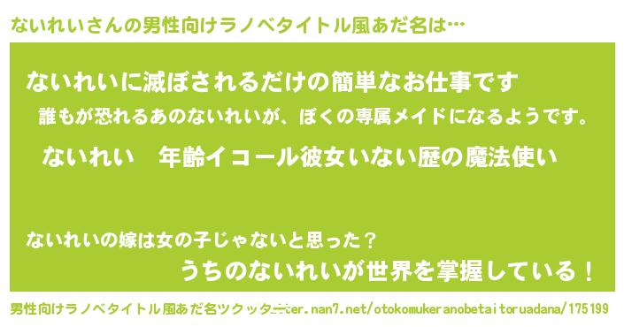 | 女子向けラノベタイトル風あだ名 | 『ないれいの玉の輿計画!』 |