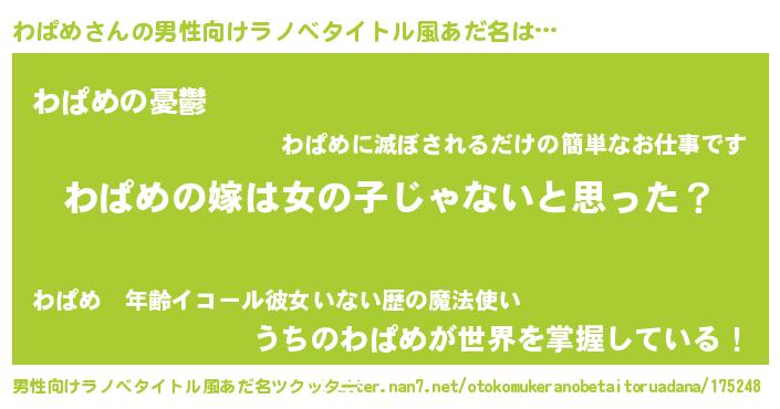| 女子向けラノベタイトル風あだ名 | 『わぱめ様がみてる』 |