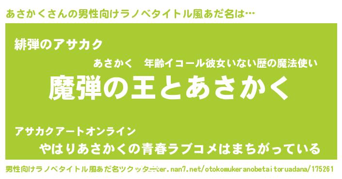 | 女子向けラノベタイトル風あだ名 | 『乙女ゲームの破滅フラグしかない悪役あさかくに転生してしまった…』 |