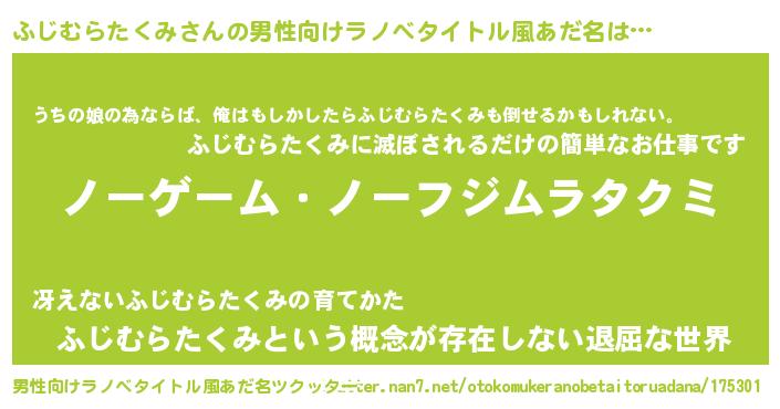 | 女子向けラノベタイトル風あだ名 | 『死神ふじむらたくみの再婚』 |