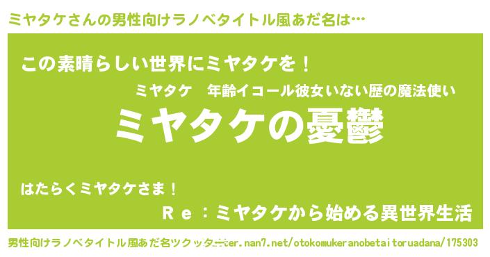 | 女子向けラノベタイトル風あだ名 | 『(仮)ミヤタケのやんごとなき事情』 |
