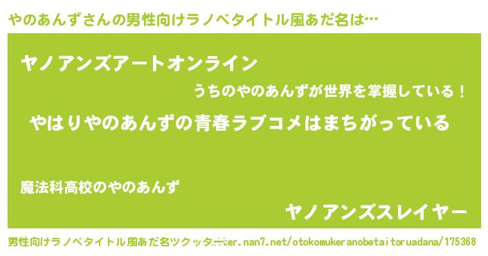 | ファンタジー風あだ名 | 『エターナルヤノアンズー』『ヤノフェル』 |