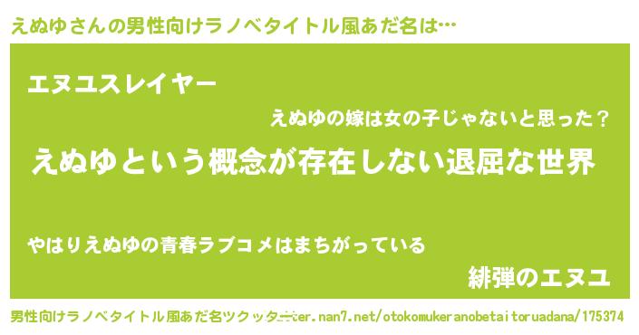 | 女子向けラノベタイトル風あだ名 | 『えぬゆの契約王妃』『えぬゆ伯爵の花嫁』 |