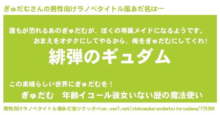 | 女子向けラノベタイトル風あだ名 | 『シンデレラぎゅだむ家の靴箱館』 |