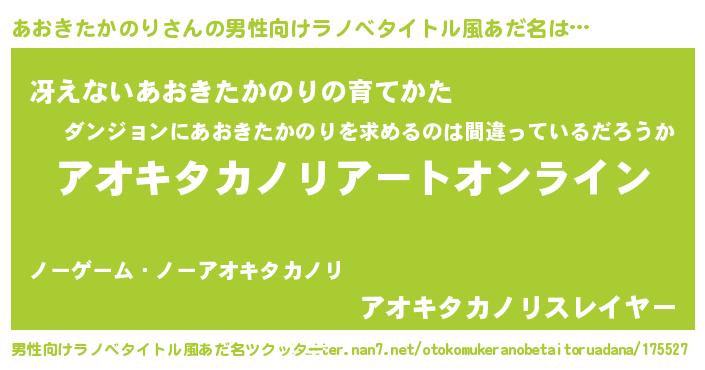 | 女子向けラノベタイトル風あだ名 | 『誰かこのあおきたかのりを説明してください! ~契約から始まるウェディング~』 |