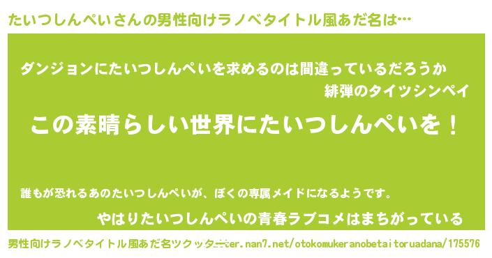| 女子向けラノベタイトル風あだ名 | 『悪役たいつしんぺいに転生したようですが、知った事ではありません』 |