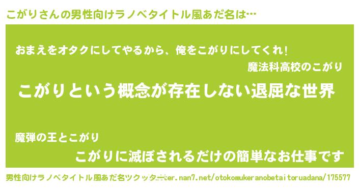| 胡散臭い通販商品みたいなあだ名 | 『絶対に幸福をもたらす招き猫…その名も「こがり」』 |