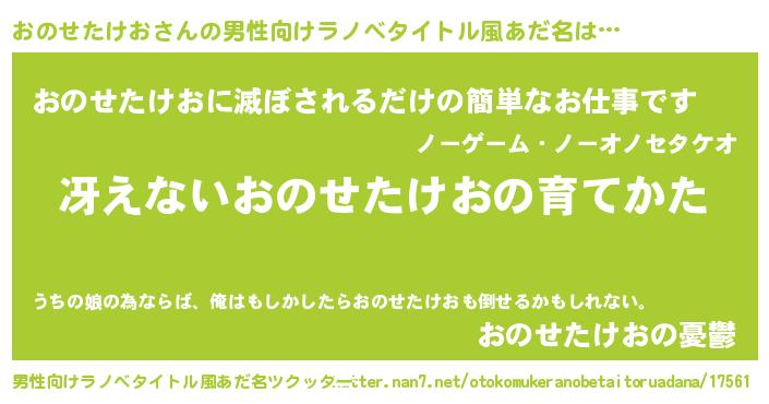 | 女子向けラノベタイトル風あだ名 | 『シンデレラおのせたけお家の靴箱館』 |