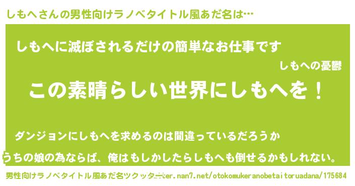 | 女子向けラノベタイトル風あだ名 | 『乙女ゲームの破滅フラグしかない悪役しもへに転生してしまった…』 |