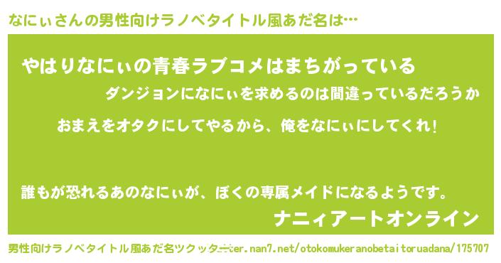 | 女子向けラノベタイトル風あだ名 | 『なにぃ夫妻のなれそめ』 |