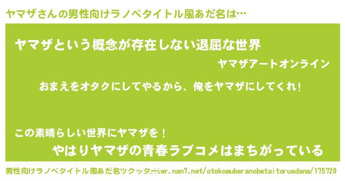 | 女子向けラノベタイトル風あだ名 | 『ヤマザ恋絵巻』『ヤマザの雑貨屋さん』 |