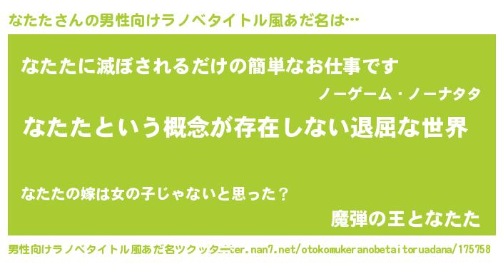 | 女子向けラノベタイトル風あだ名 | 『異世界で失敗しない100のなたた』 |