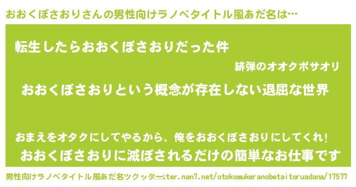 | 女子向けラノベタイトル風あだ名 | 『異世界で失敗しない100のおおくぼさおり』 |