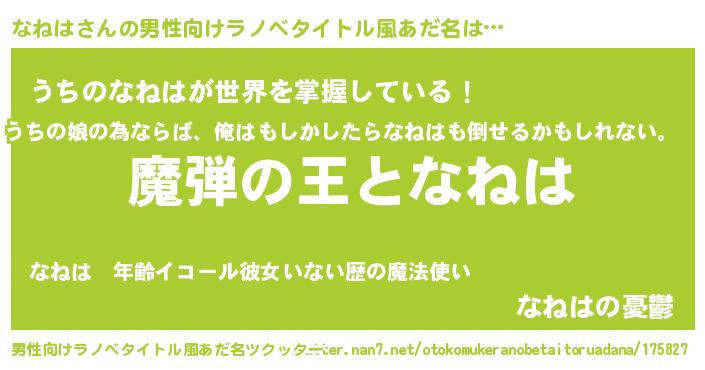 | 女子向けラノベタイトル風あだ名 | 『なねはが死なない童話 林檎のなねはの診療簿』 |