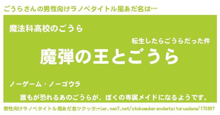 | 女子向けラノベタイトル風あだ名 | 『乙女ゲームの破滅フラグしかない悪役ごうらに転生してしまった…』 |