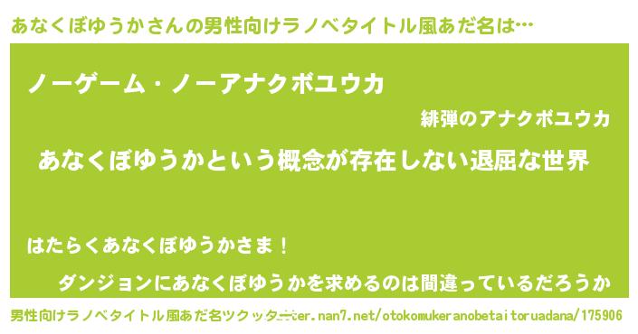 | 女子向けラノベタイトル風あだ名 | 『異世界で失敗しない100のあなくぼゆうか』 |