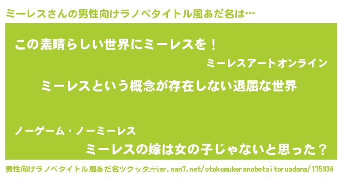 | 女子向けラノベタイトル風あだ名 | 『ミーレスの契約王妃』『ミーレス恋絵巻』 |