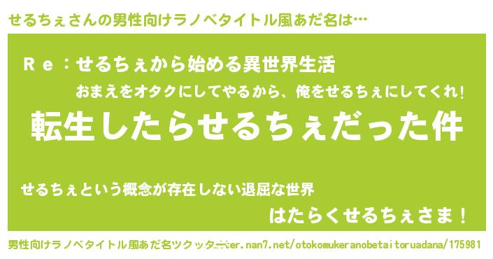 | 女子向けラノベタイトル風あだ名 | 『せるちぇの玉の輿計画!』 |