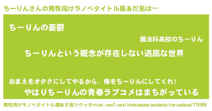 | 女子向けラノベタイトル風あだ名 | 『異世界で失敗しない100のちーりん』 |