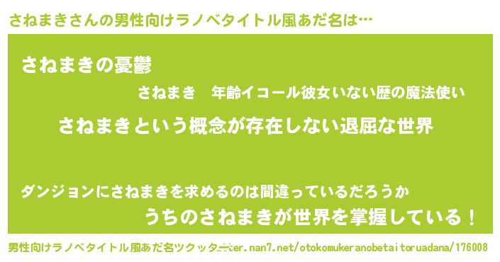| 女子向けラノベタイトル風あだ名 | 『異世界で失敗しない100のさねまき』 |