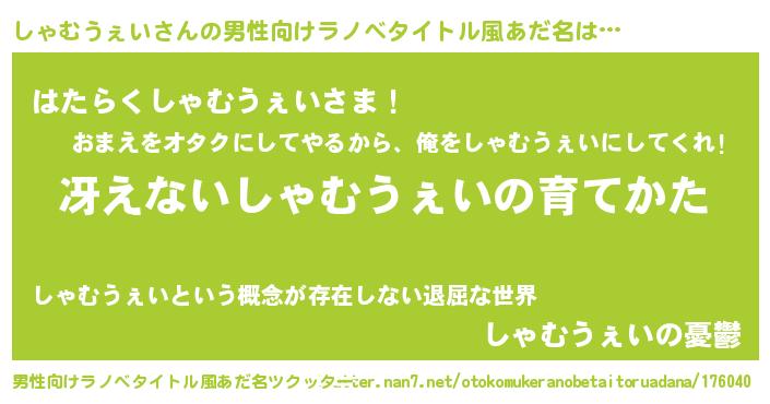 | 女子向けラノベタイトル風あだ名 | 『男装しゃむうぇいの憂鬱な任務』 |