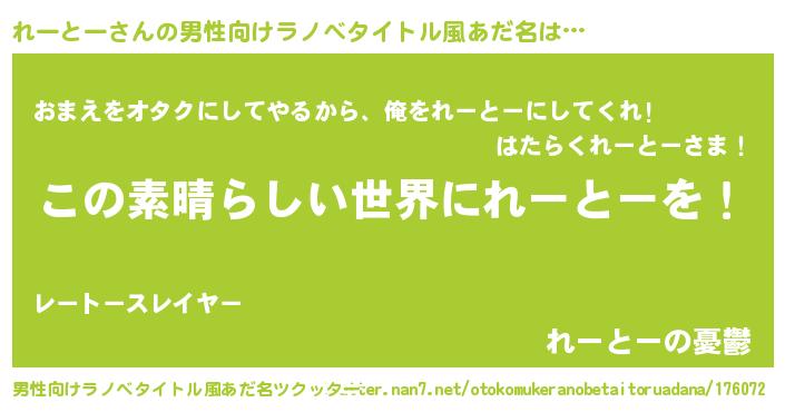 | 女子向けラノベタイトル風あだ名 | 『乙女ゲームの破滅フラグしかない悪役れーとーに転生してしまった…』 |