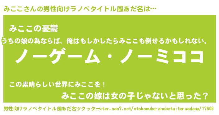 | 女子向けラノベタイトル風あだ名 | 『死神みここの再婚』『みここ様がみてる』 |