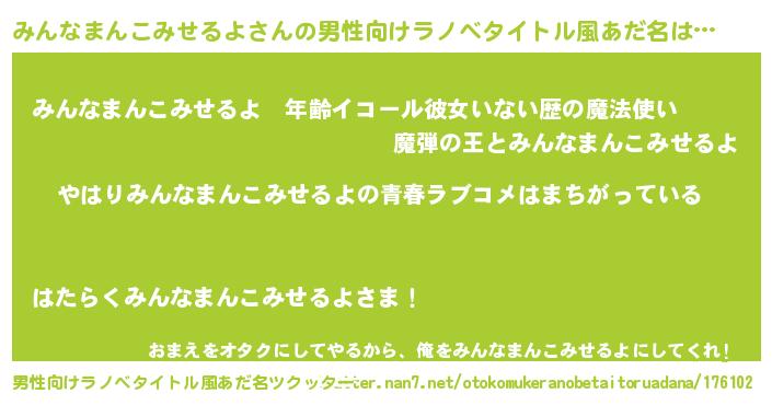 | 胡散臭い通販商品みたいなあだ名 | 『世界が平和になる高級そうな壺…その名も「みんなまんこみせるよ」』 |