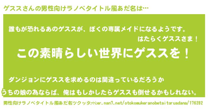 | 女子向けラノベタイトル風あだ名 | 『悪役ゲススに転生したようですが、知った事ではありません』 |