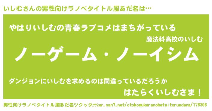 | 女子向けラノベタイトル風あだ名 | 『死神いしむの再婚』『いしむ伯爵の花嫁』 |