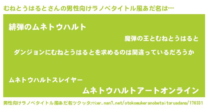 | 女子向けラノベタイトル風あだ名 | 『むねとうはるとの卵を拾いまして』 |
